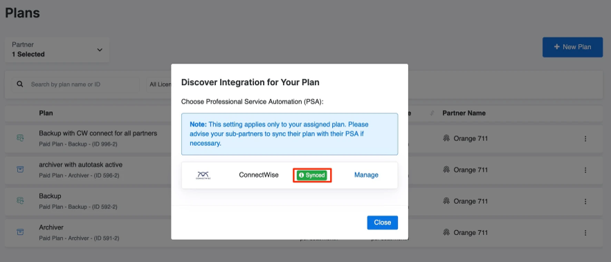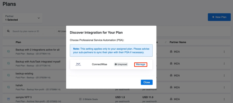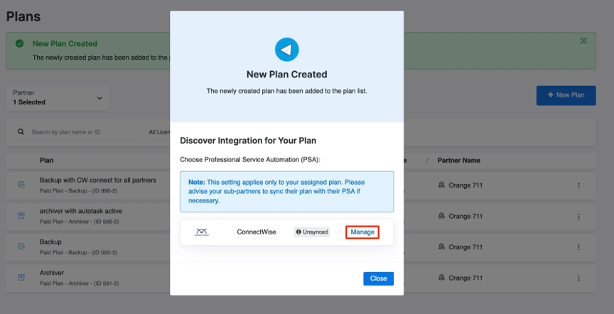 - A popup will appear. Click Manage to proceed with mapping the plan with ConnectWise.