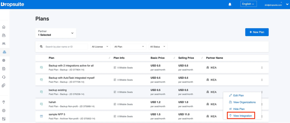 After successfully mapping the plan, you will notice a green checkmark indicating success, and the Unlink button will appear. - Upon returning to the plan page, click on the Menu button (three vertical dots) and select View Integration. You will now see the Synced badge indicating that the plan is synchronized with the integration.