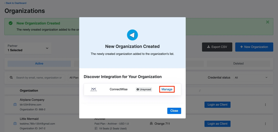 Step 5: Create a New Organization Connected Through ConnectWise Integration