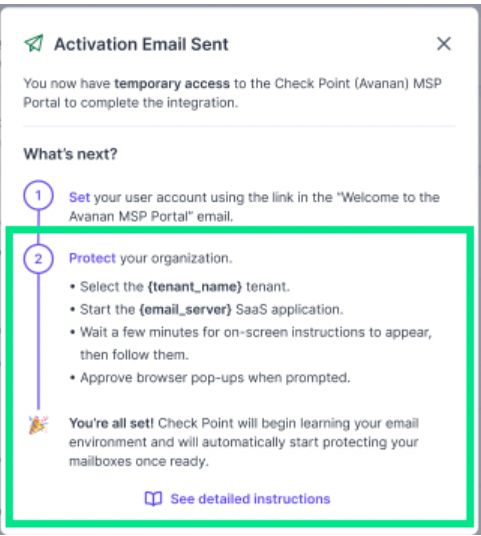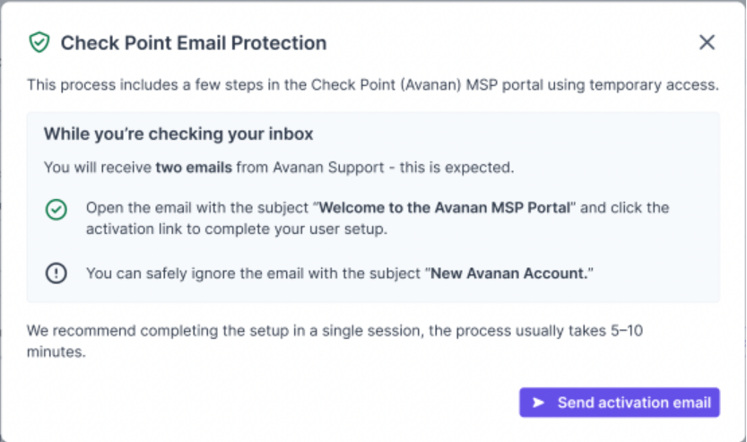 If activation fails or redirects to the Avanan login page, confirm using one of these browsers. Other browsers (like Firefox, Safari, or Brave) may block session cookies and cause the activation to fail. - Partners using MPmail may experience issues when activating Check Point email protection within Guardz. Please contact Support before activating.
