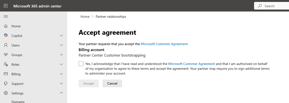 When reaccepting the MCA using this method, Partner Center updates ‘Customer acceptance through Microsoft’ to ‘Provided’.